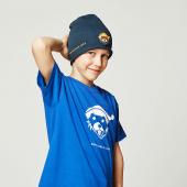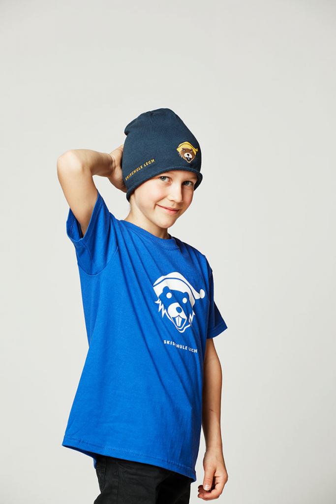 trendige "Brooklyn Beanie" Mütze in dunkelblau mit Stick "Skischule Lech" und unserem Maskottchen "Pfiff"